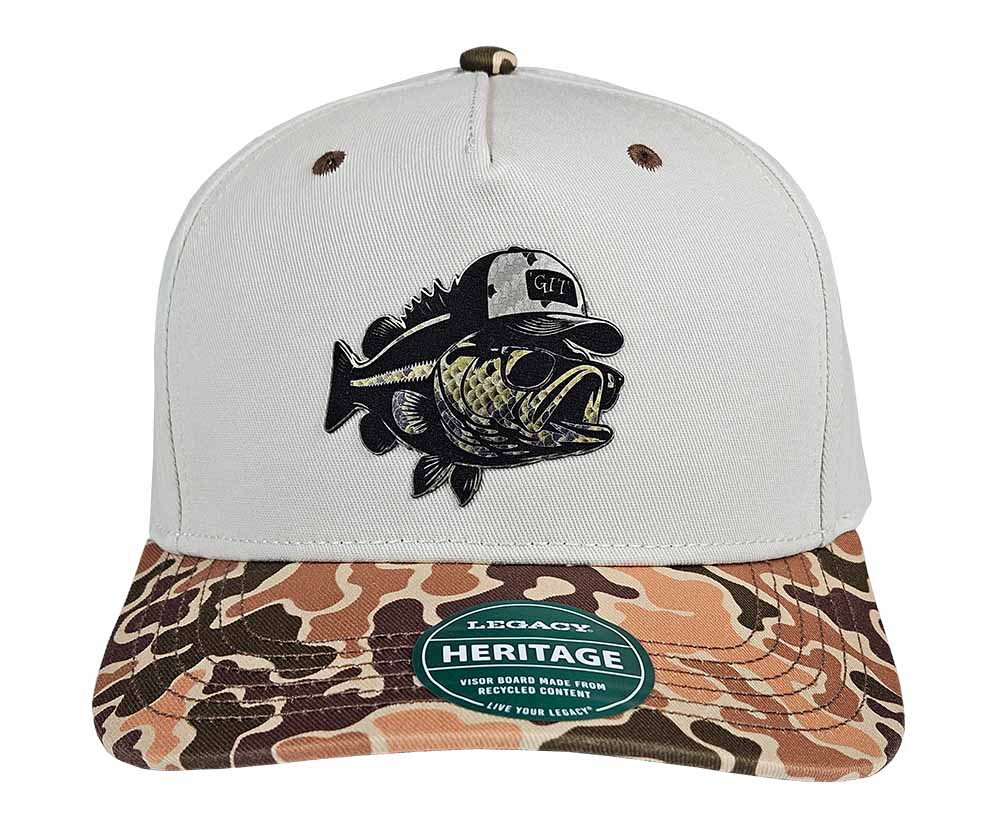 Show off your bass fishing style with this premium laser engraved metallic UV printed bass pattern to black leatherette git bass patch hat. The awesome largemouth bass print is sure to turn heads! Featured on the stunning Legacy Heritage 100% cotton twill trucker hat in stone and duck camo brim, two-tone construction with contrast eyelets and button, and adjustable snapback closure. The soft twill feel of the hat material, texture, and beautiful structured stiching add to the high-end design of this hat.