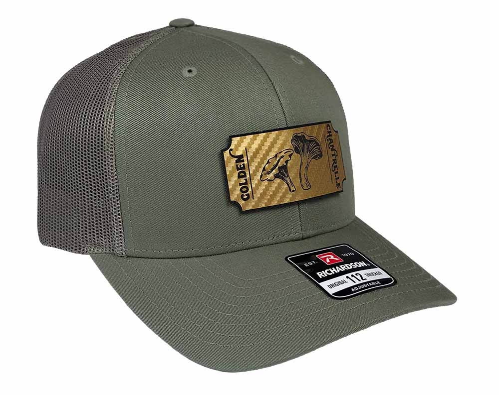 Are you a mushroom hunting enthusiast? The stunning golden chantrelle mushroom trucker hat is perfect for you! This unique chantrelle mushroom design is laser engraved on premium gold carbon fiber to black leatherette. Featured on the awesome Richardson 112 trucker hat in white and black brim, black, od green, and caramel and black mesh with fully adjustable snapback closure.