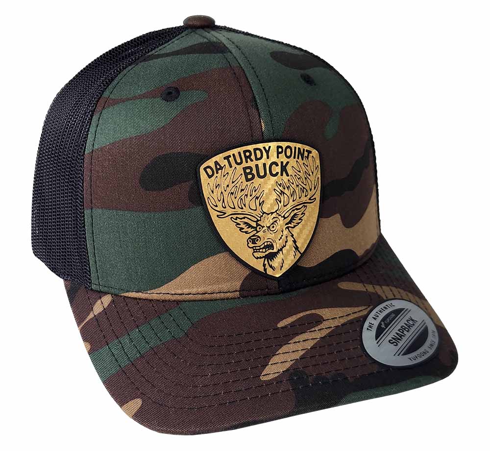 Love hunting, bucks, and late 80's nostalgia? This hat is for you! Inspired by the hilarious song, Da Turdy Point Buck design is laser engraved on premium gold carbon fiber to black leatherette. Featured on the popular Yupoong classic green camo and black mesh trucker hat with adjustable snapback closure.