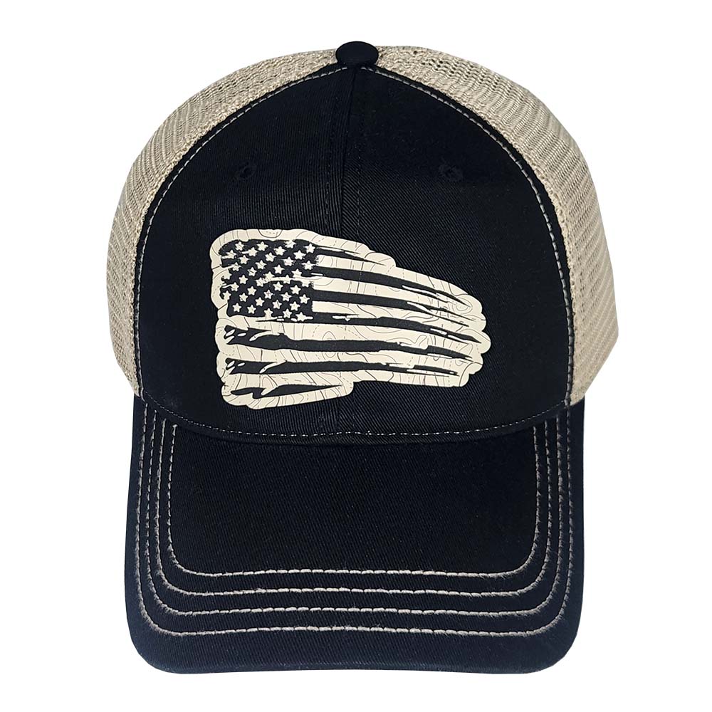 Show your USA pride with this awesome vintage flag design laser engraved on premium tan topographical to black leatherette. Featured on the popular Richardson 111 garment washed trucker hat in black and khaki mesh for optimal comfort. Adjustable snapback closure.